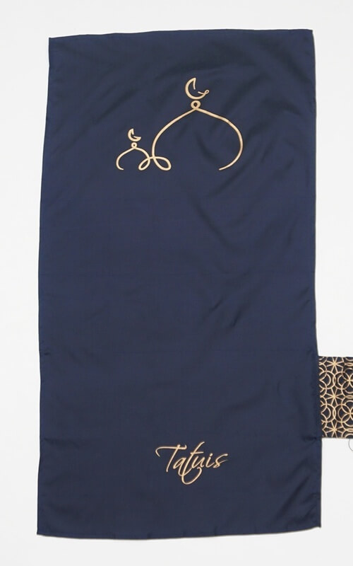 Sajadah ini hadir dengan warna biru navy yang elegan dan menenangkan. Pada bagian atas sajadah, terdapat motif kaligrafi yang ditulis dengan warna emas sementara bawahnya adalah nama brand-nya.
