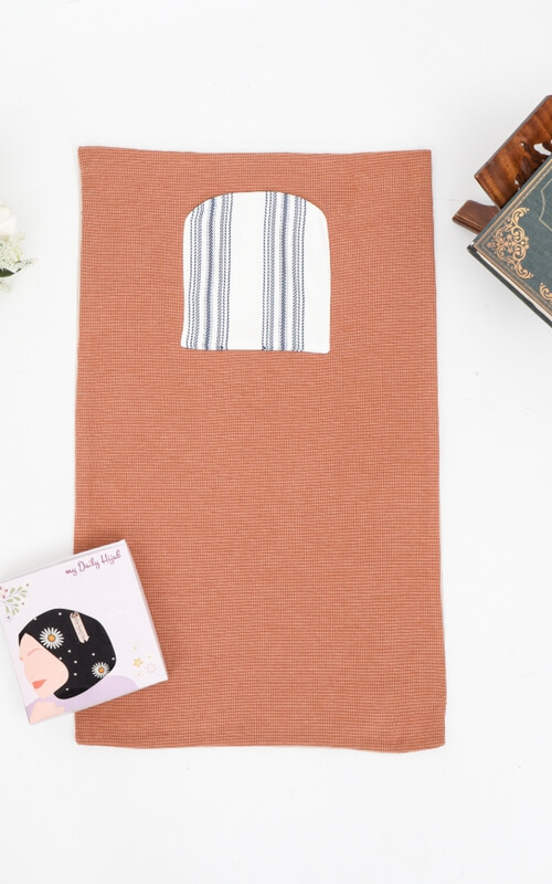 Sajadah ini hadir dengan warna coklat yang hangat dan menenangkan. Desainnya yang minimalis dengan sedikit aksen garis vertikal di bagian atas memberikan kesan modern dan sederhana. Warna coklat memberikan kesan earth tone.