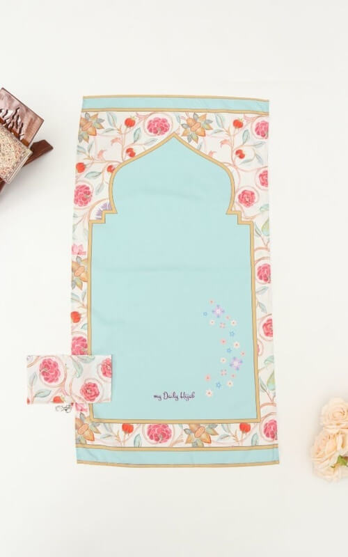 Selanjutnya, ada sajadah dengan warna mint yang sejuk dan menenangkan. Dihiasi dengan motif floral di sekelilingnya, sajadah ini memberikan nuansa alami dan segar saat digunakan. Motif bunga yang berwarna cerah menambahkan sentuhan artistik yang membuat sajadah ini tampak cantik.