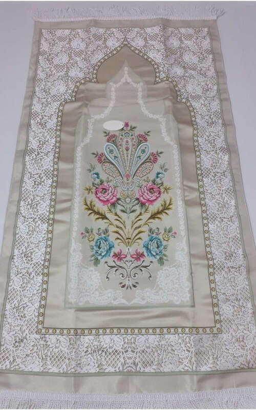 Sajadah Turki juga cocok digunakan sebagai hampers seserahan untuk pernikahan. Kamu bisa memilih sajadah turki yang berwarna kalem seperti ini. Meskipun warnanya kalem, di bagian tengah sajadah dihiasi dengan corak bunga, daun, dan tumbuhan.