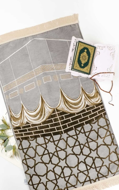 Rekomendasi sajadah Turki pertama adalah sajadah Luxury Suede Kabah Series. Seperti namanya, sajadah ini memiliki desain utama gambar kabah. Sajadah ini memiliki warna dasar abu-abu dengan desain kabah berwarna gradasi cokelat dan hitam, sehingga tampak estetik.