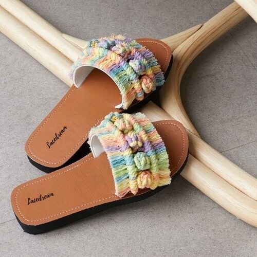 Kalau kamu lebih suka dengan sandal yang colorfull, selop yang satu ini bisa jadi pilihan terbaik. Strapnya terbuat dari tali katun, sama seperti model sebelumnya.