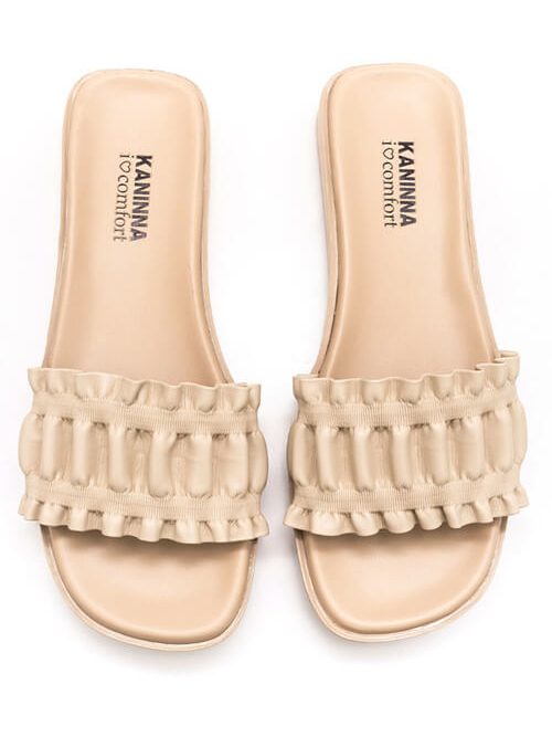 Strapnya dibuat dari bahan PU leather atau kulit sintesis yang dipadukan dengan karet sehingga membentuk kerutan. Meski terlihat simpel, alas kaki yang satu ini tampak sangat girly.