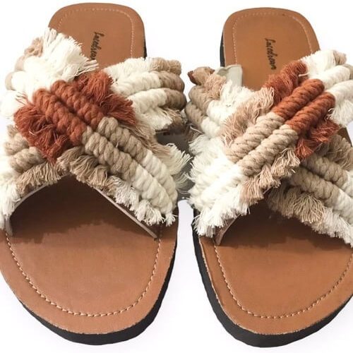 Modelnya sangat edgy karena menggunakan tali katun untuk bagian strapnya. Perpaduan warna earth tone-nya juga sangat cantik. Kamu bisa memadukan sandal ini dengan outfit cewek bumi.