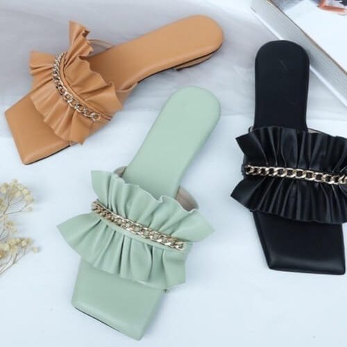 Tampilan sandal ini semakin manis karena aksen rantai di bagian strapnya. Ada berbagai warna yang bisa kamu pilih, Dear.