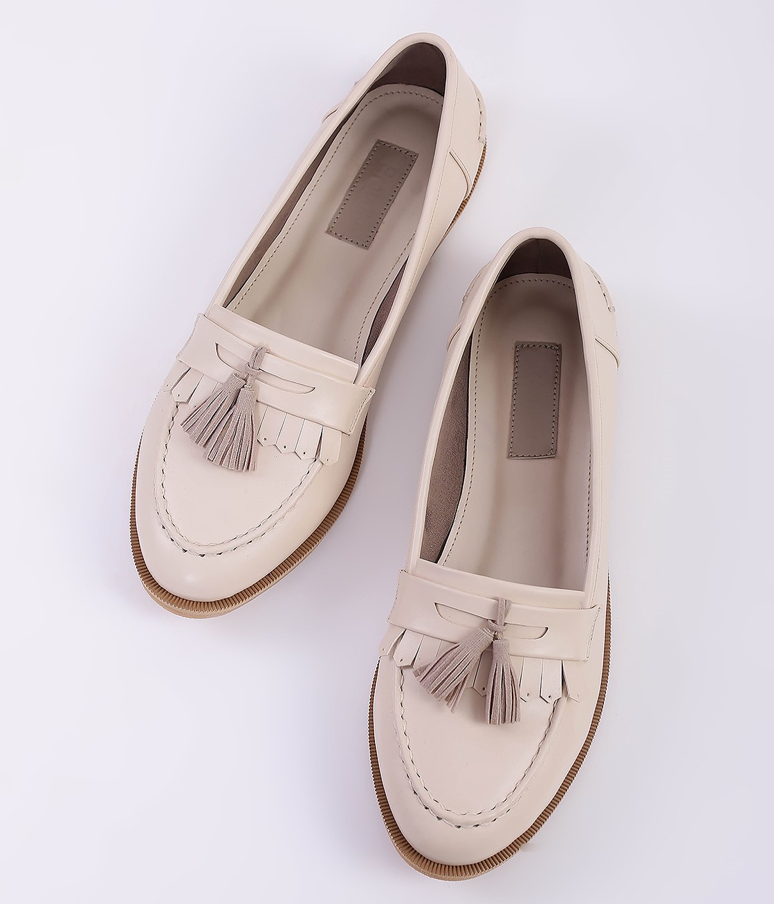 Untuk melengkapi gaya unikmu, loafers dengan kombinasi warna nude dan aksen tassel yang menarik bisa menjadi pilihanmu.