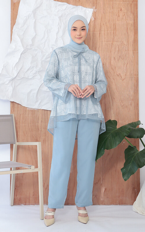 Sedangkan atasannya berupa blouse berlayer kain transparan yang ditambah aksen pita di bagian leher. Semakin fresh kalau kamu padukan dengan pashmina warna biru muda juga. Adem banget deh dilihatnya!