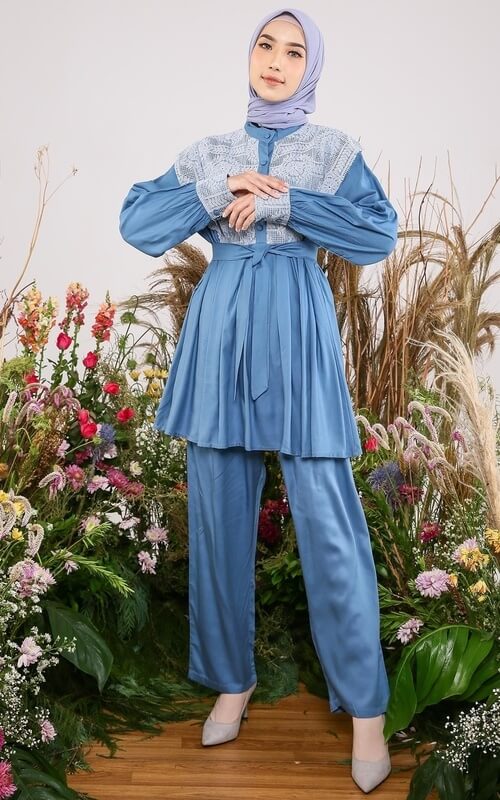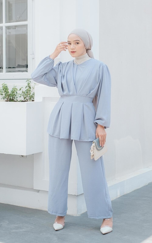 Simpel tapi kece! Setelan celana dengan warna biru kalem ini bisa kamu jadikan outfit jalan-jalan saat siang hari. Potongan bajunya ramping tapi tetap sopan dengan model plisket dan lengan panjang yang ujungnya pakai karet.
