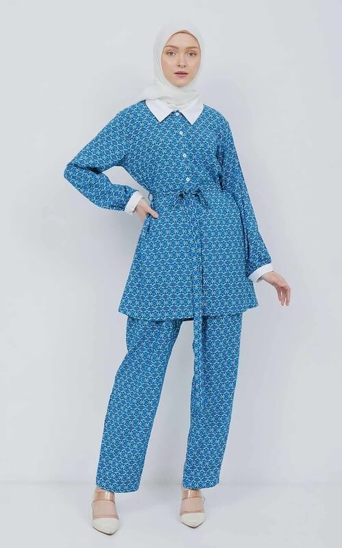 Setelan biru full motif kayak gini juga bisa jadi outfit ngantor yang curi perhatian lho. Desainnya berkerah jadi berikan kesan formal, dan kombinasi kain putih bikin look yang semakin cerah.