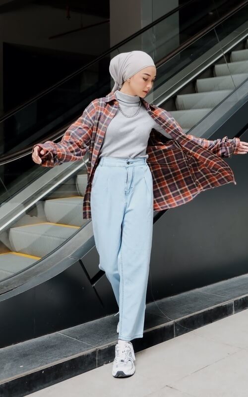 Kalau kamu pernah melihat outfit influencer asal Korea yang baru saja mualaf, pasti tahu busana sporty vibes ini pernah viral saat dikenakannya. Cukup memadukan inner manset warna coklat, dengan kemeja kotak-kotak warna senada.