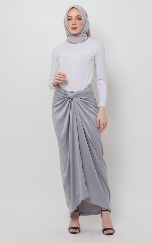 Pilihan pertama adalah rok lilit berbahan sifon dengan tali pengikat di bagian depan. Sepintas terlihat seperti rok span, tapi gerakan kaki saat memakainya akan lebih leluasa jika dibandingkan rok span.