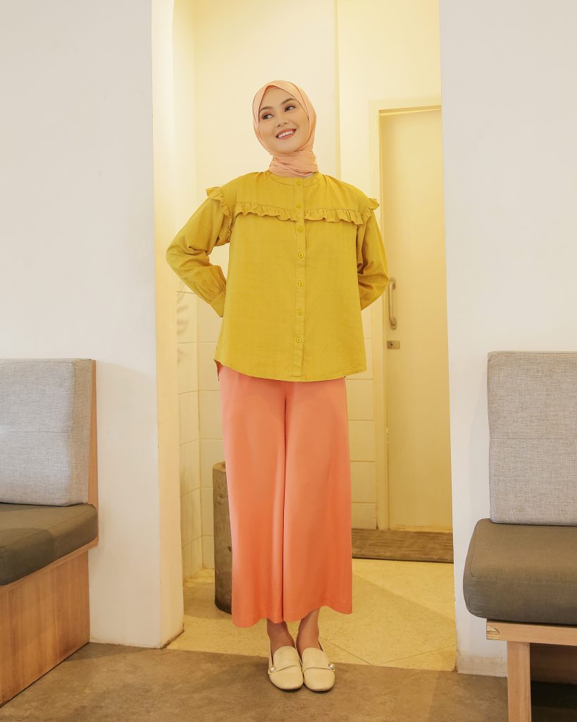 Di look ini, Minju memadukan blouse berwarna light yellow yang memiliki aksen ruffle pada dada dan juga pergelangan lengannya, Dear. Lalu, biar look-nya terkesan less boring, untuk bawahan dan juga hijabnya Minju juga memilih items dengan warna peach yang vibrant. Sungguh perpaduan warna yang menarik, bukan?