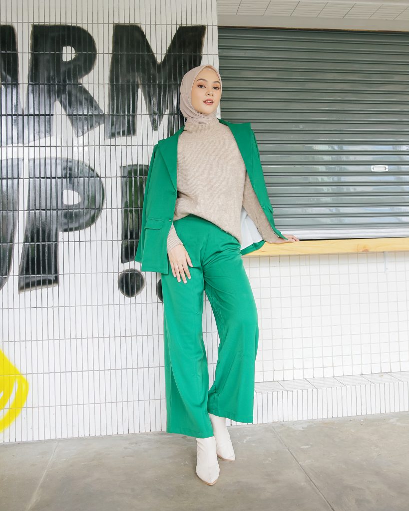 Outfit ini memadukan blazer berwarna royal green yang senada dengan warna celananya. Nah, kalau kamu termasuk orang yang suka dengan style modest dan sleek, Minju yakin kamu akan jatuh cinta dengan look yang satu ini.