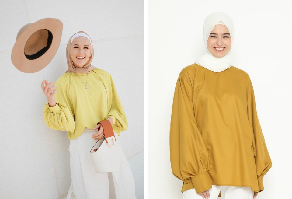 Tampil lebih fresh dengan baju berwarna cerah! Seperti blouse kuning yang dikenakan Eileen. Blouse berwarna kuning paling tepat dipadukan dengan bawahan berwana putih agar outfit terlihat fresh dan stylish. Kamu juga bisa memadukan hijabnya dengan warna netral atau printed scarf sesuai selera kamu. Loh!