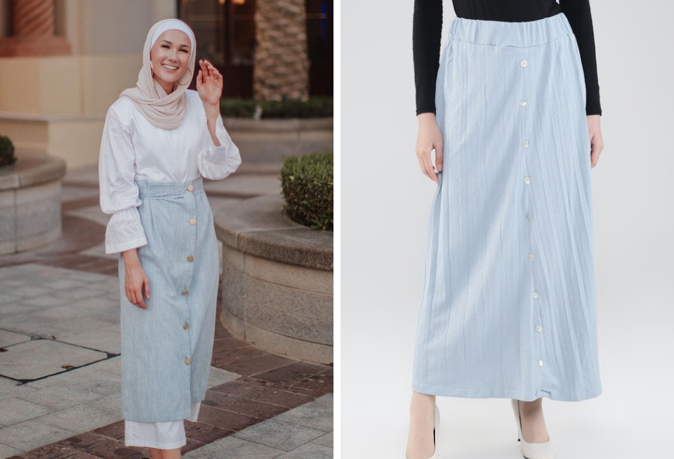 Bosan dengan warna rok yang itu-itu saja? Coba deh, sesekali gunakan rok berwarna biru. Warna biru akan membuat tampilan kamu lebih effortless chic. Kamu bisa memadukan rok warna biru pastel dengan blouse putih. Jangan lupa gunakan hijab dengan warna netral ya, dear!