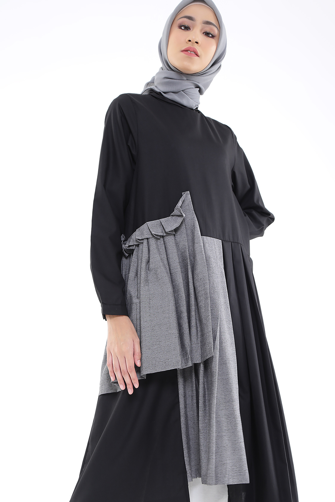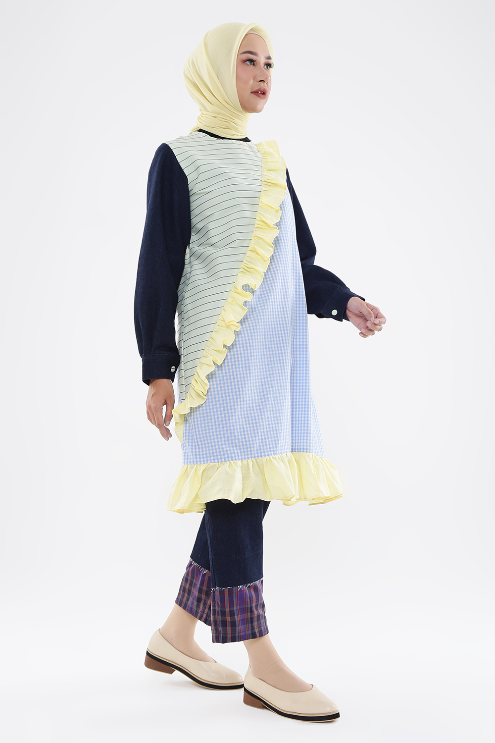 Meski sudah menjadi tren sejak beberapa waktu lalu, tunik asimetris terus berkembang. Motif ruffle dan lipit yang dipadukan bersamaan menambah kesan stylish pada tampilanmu.