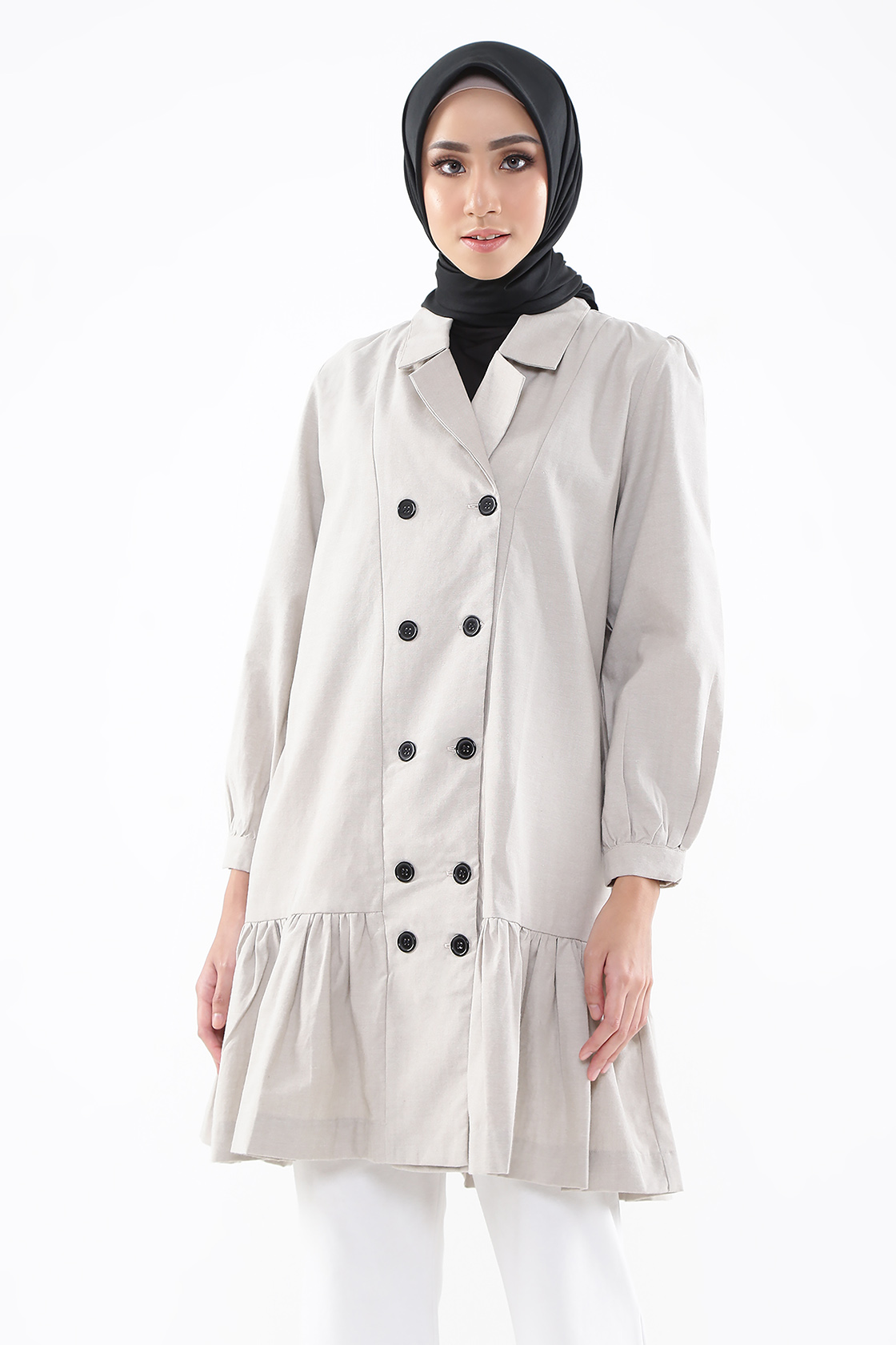 Model tunik satu ini mengadaptasi model coat yang memiliki banyak kancing besar di bagian depan. Cocok untuk kamu kenakan saat musim hujan nih, dear!