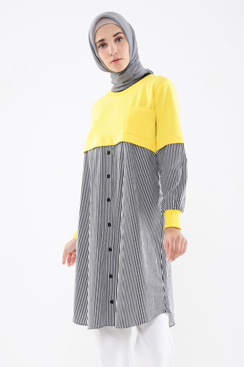Atasan two tone masih menjadi tren saat ini. Bila sebelumnya permainan warna lebih dominan, kali ini paduan warna vibrant dengan motif menjadi pilihan. Berikan kesan playful nan stylish dengan tunik yang satu ini!