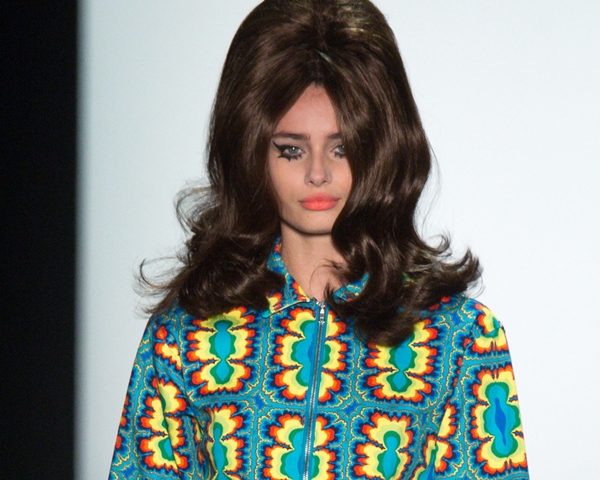 Model Taylor Hill dalam peragaan busana Jeremy Scott yang menampilkan gaya 60-an, terlihat menggunakan lipstik berwarna Coral dengan kesan Matte. Warna Coral tampak serasi dengan penggunaan perona mata yang natural serta dipadu dengan goresan eyeliner yang dramatis.