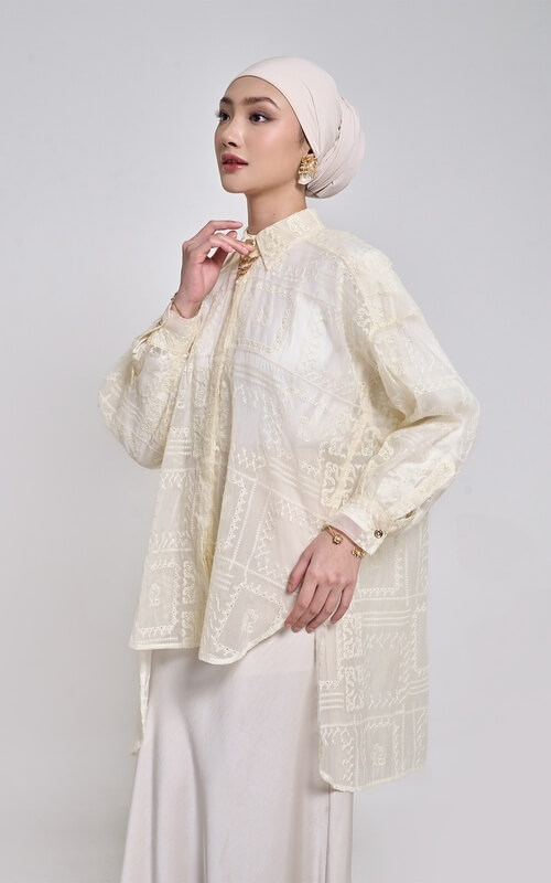 Tunik kedua didominasi warna krem yang lembut, dihiasi motif lace tipis yang menampilkan kesan mewah. Bahannya sedikit lebih tebal, sehingga memberi struktur yang baik dan tidak mudah kusut. Potongan asimetris di bagian bawah tunik menambah nilai estetik, sekaligus membuat busana ini tampak unik.