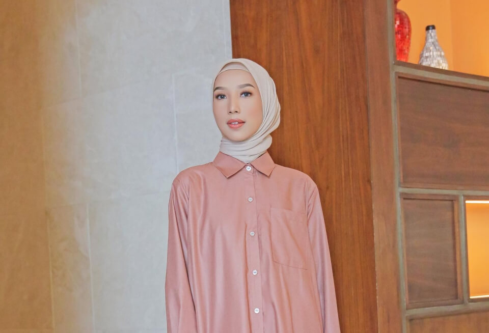 Selain itu, terdapat detail lipatan di bagian depan dengan kancing tersembunyi sehingga mempertegas bentuk tunik yang flowy namun tetap terstruktur. Tunik ini cocok dipadukan dengan rok warna pink polos dan hijab bermotif warna putih yang menciptakan tampilan lebih seimbang.