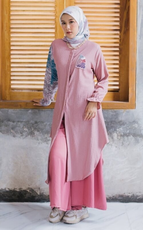 Nah, kamu bisa padukan tunik ini dengan inner berwarna hitam, Dear sehingga menutupi seluruh auratmu. Untuk bawahannya sendiri kamu bisa padukan dengan kulot lebar berwarna pink yang sedikit lebih muda warnanya dari tunik.