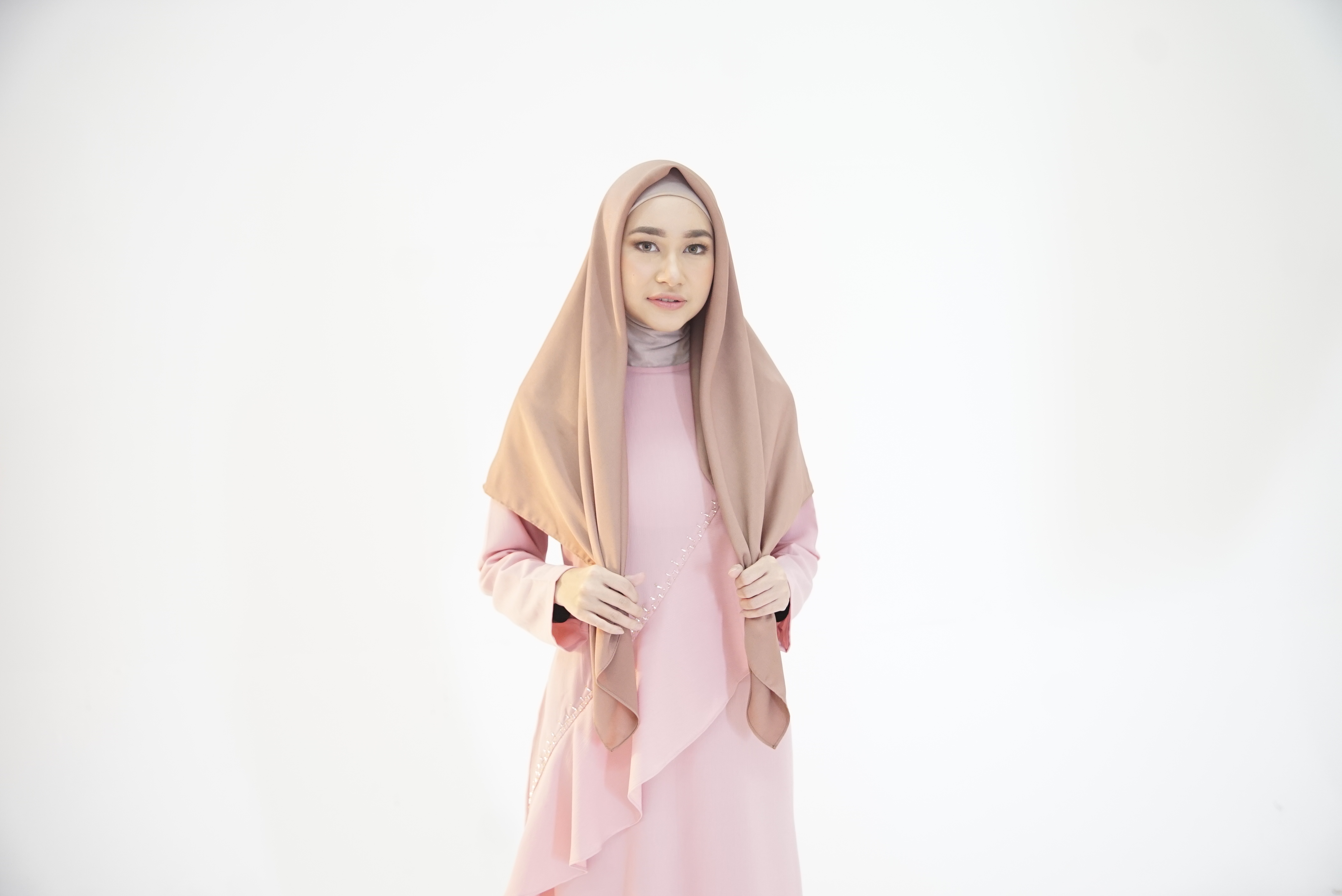 Pilih jilbab segi empat polos berbahan satin. Pakai jilbab dengan ukuran sama panjang.