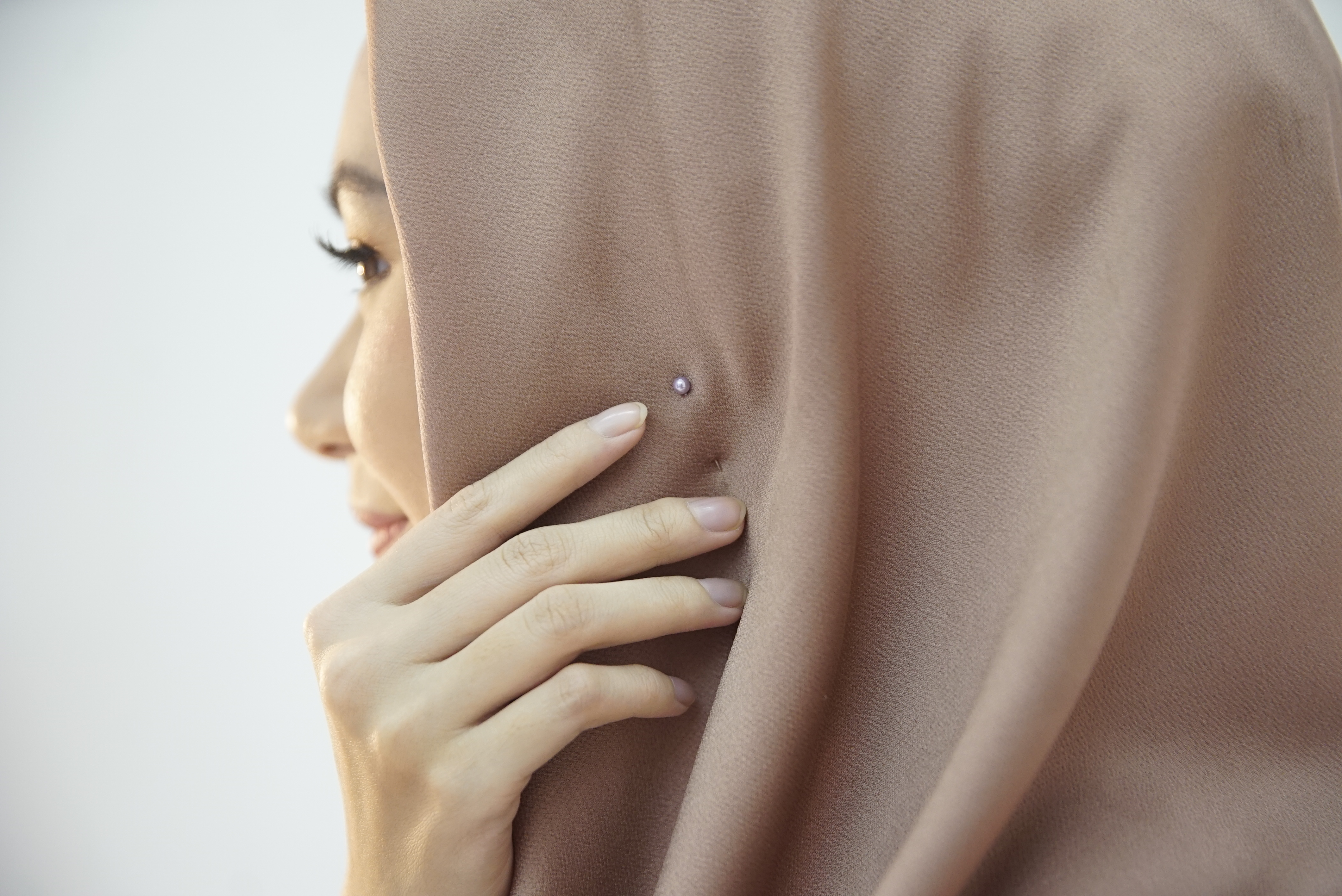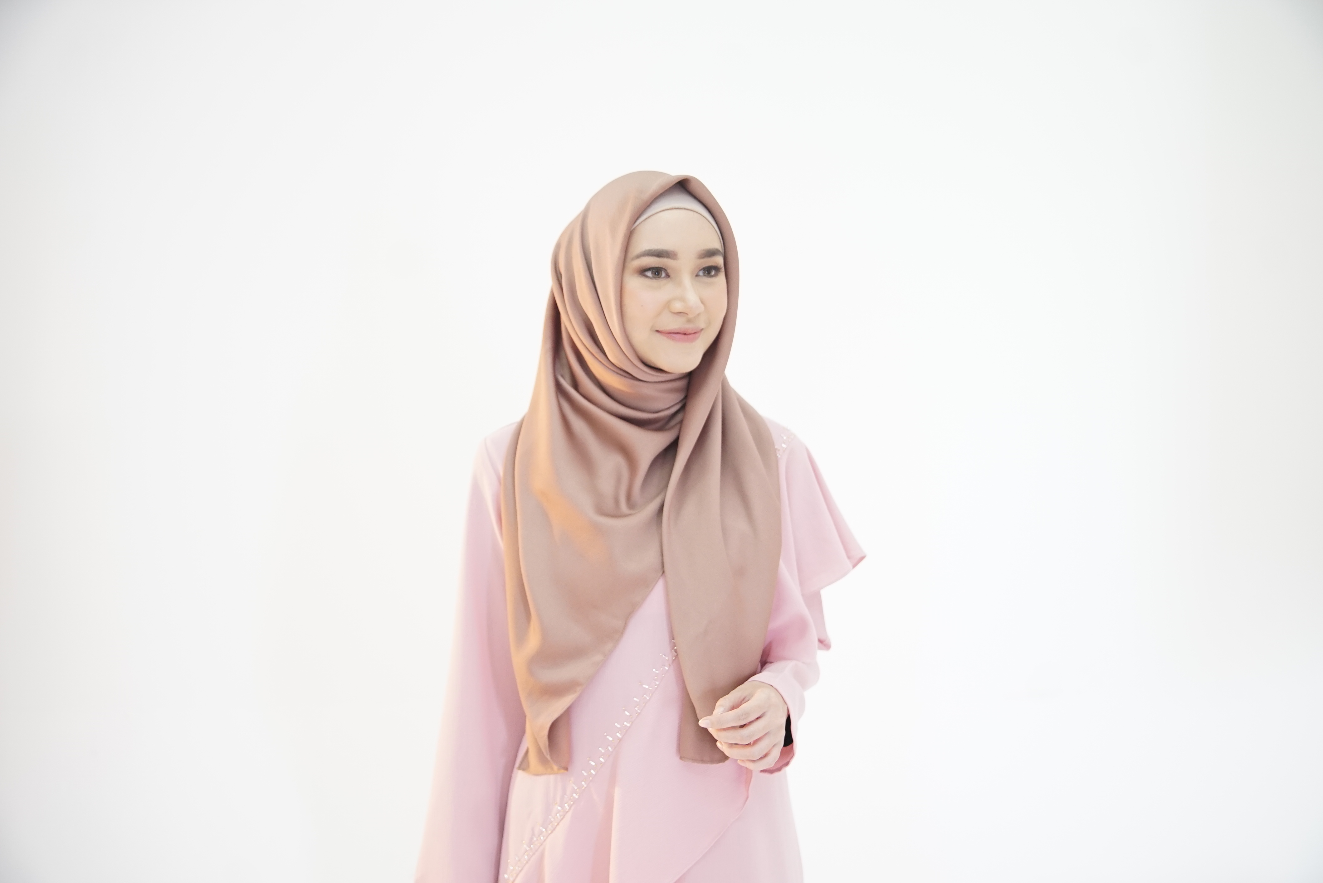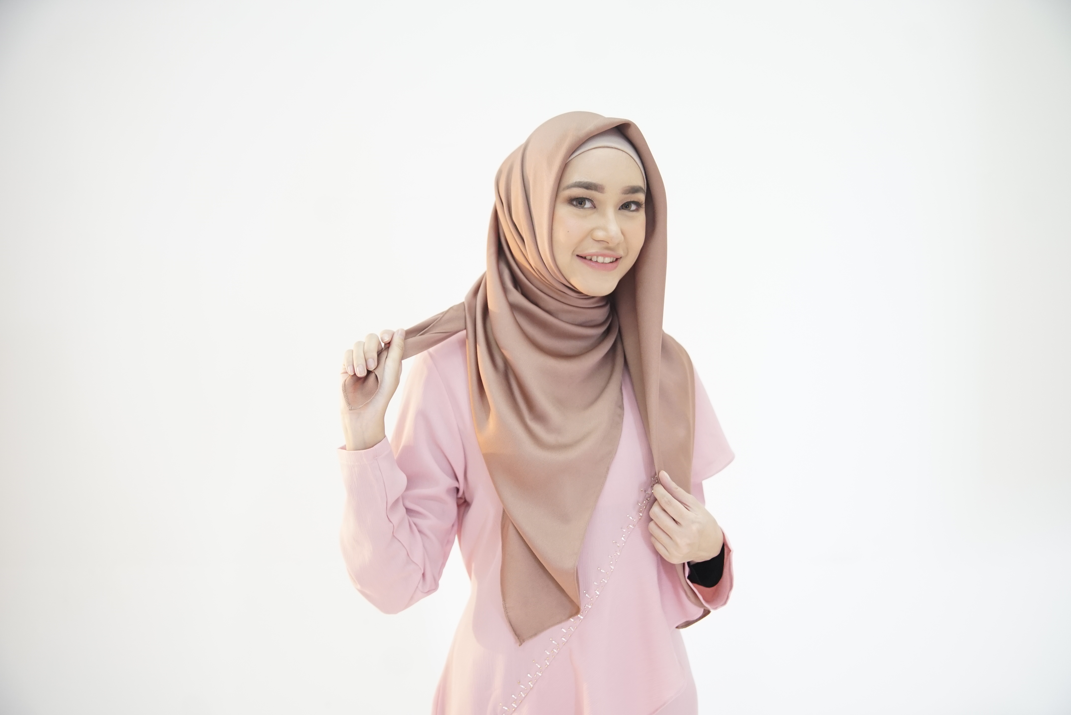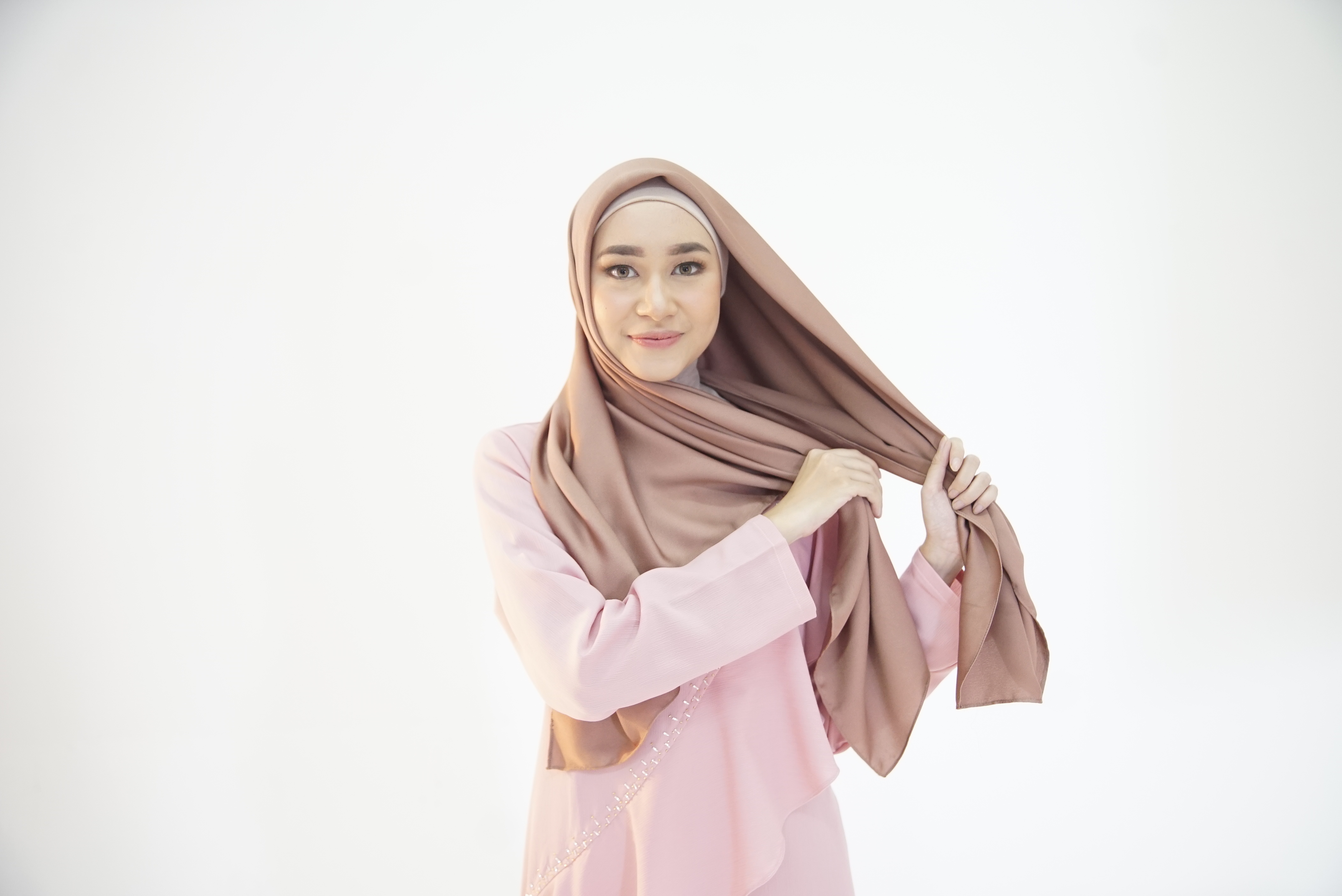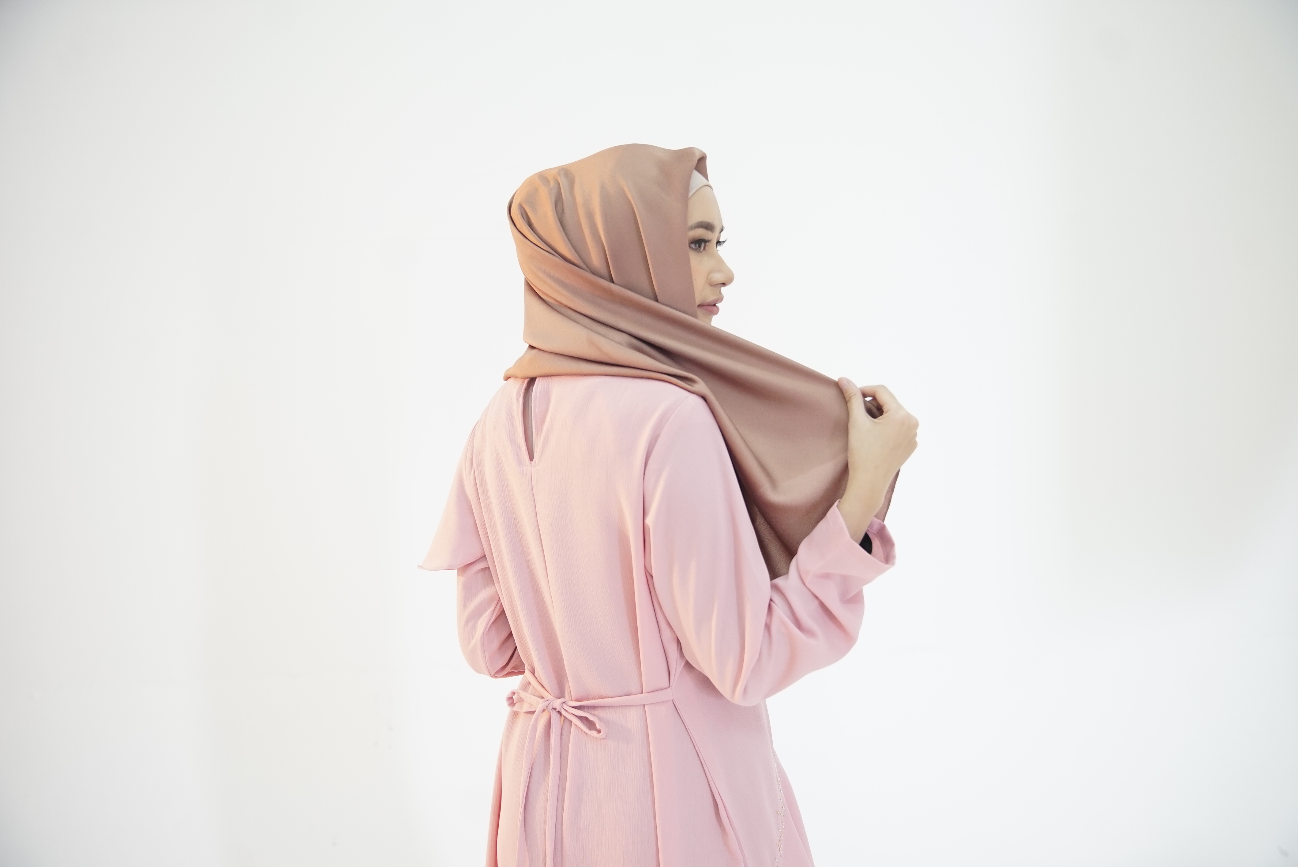 Tarik ujung jilbab ke sebelah kiri, mengelilingi leher.